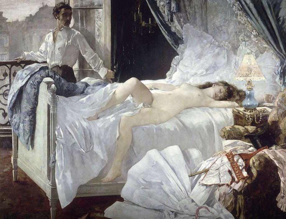 Центр композиции - сияющая белизной постель под пышным балдахином. На смятых простынях спит совершенно обнаженная девушка. Ее юное тело представлено зрителю в откровенной позе, которая смущала даже искушенную парижскую публику.