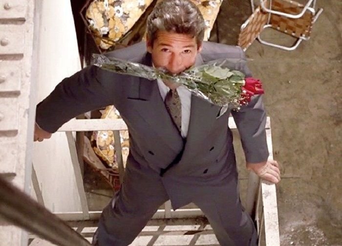 Всем запомнился романтичный финал, который считается одним из величайших голливудских хэппи-эндов. Влюблённый «принц на белом коне» да ещё и с букетом роз в зубах…