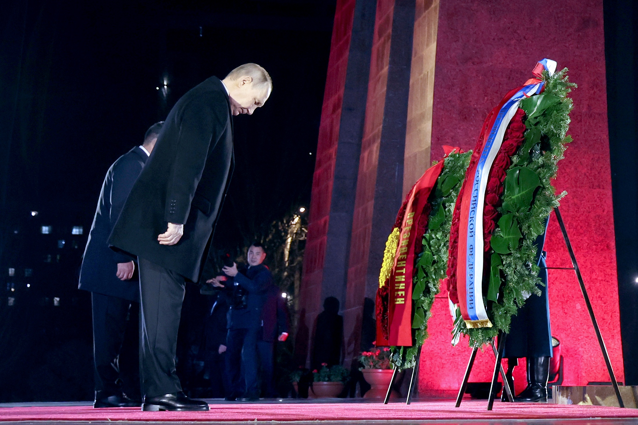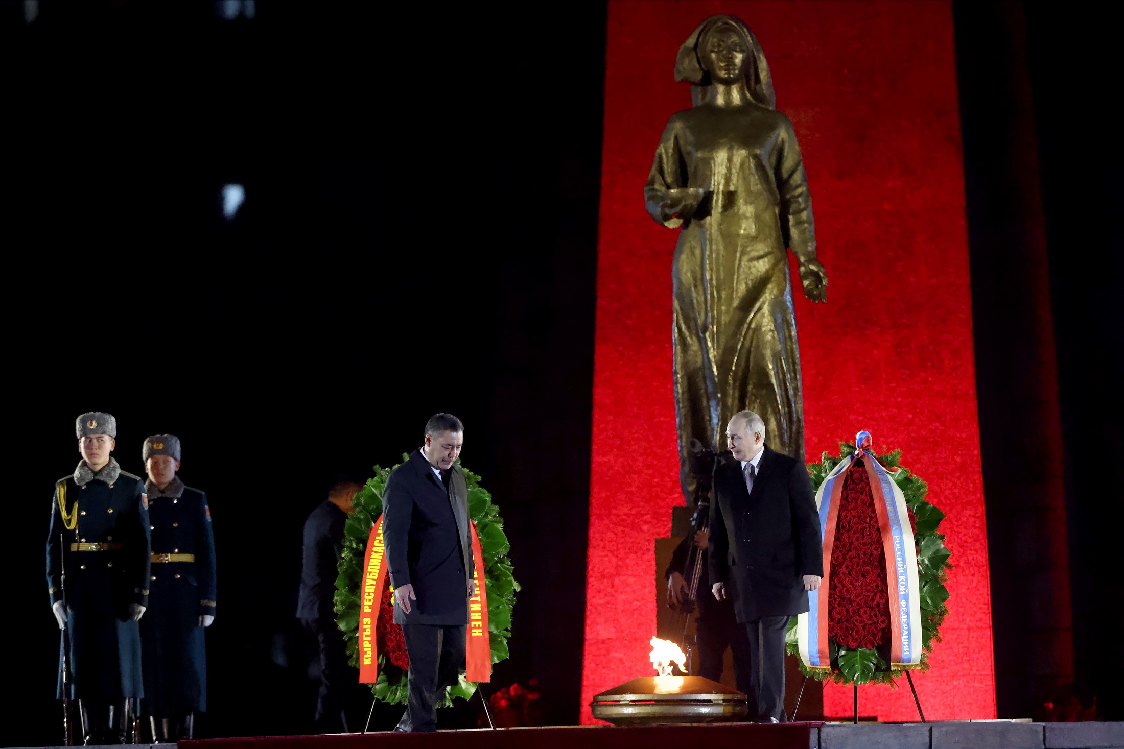 Под траурную музыку лидеры в сопровождении почетного караула поднялись на площадку мемориала. Когда венки были установлены, Путин и Жапаров расправили траурные ленты и почтили минутой молчания память погибших в Великой Отечественной войне. После чего раздался воинский салют. Затем президенты отправились в резиденцию "Ала-Арча" поговорить тет-а-тет в неформальной обстановке.