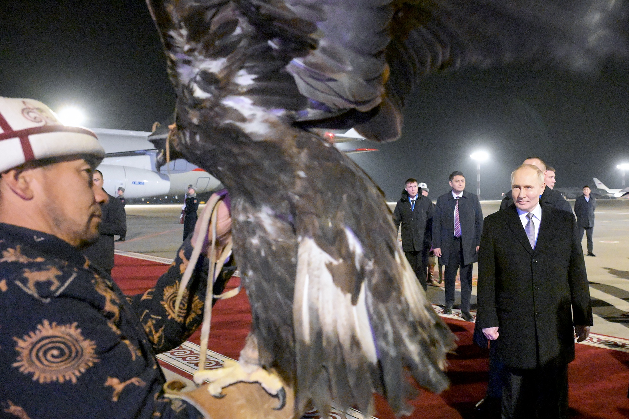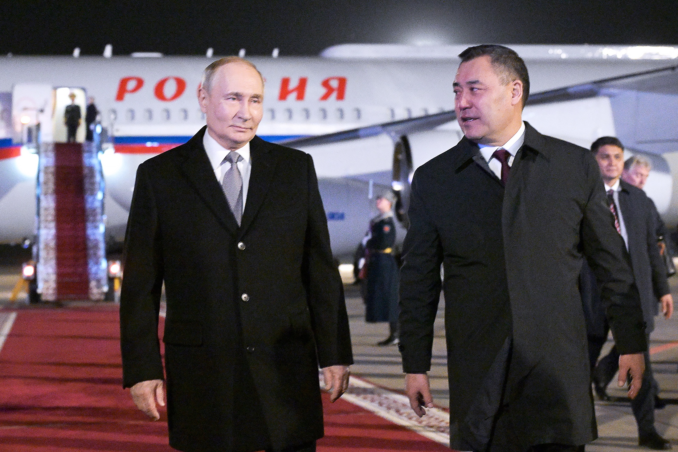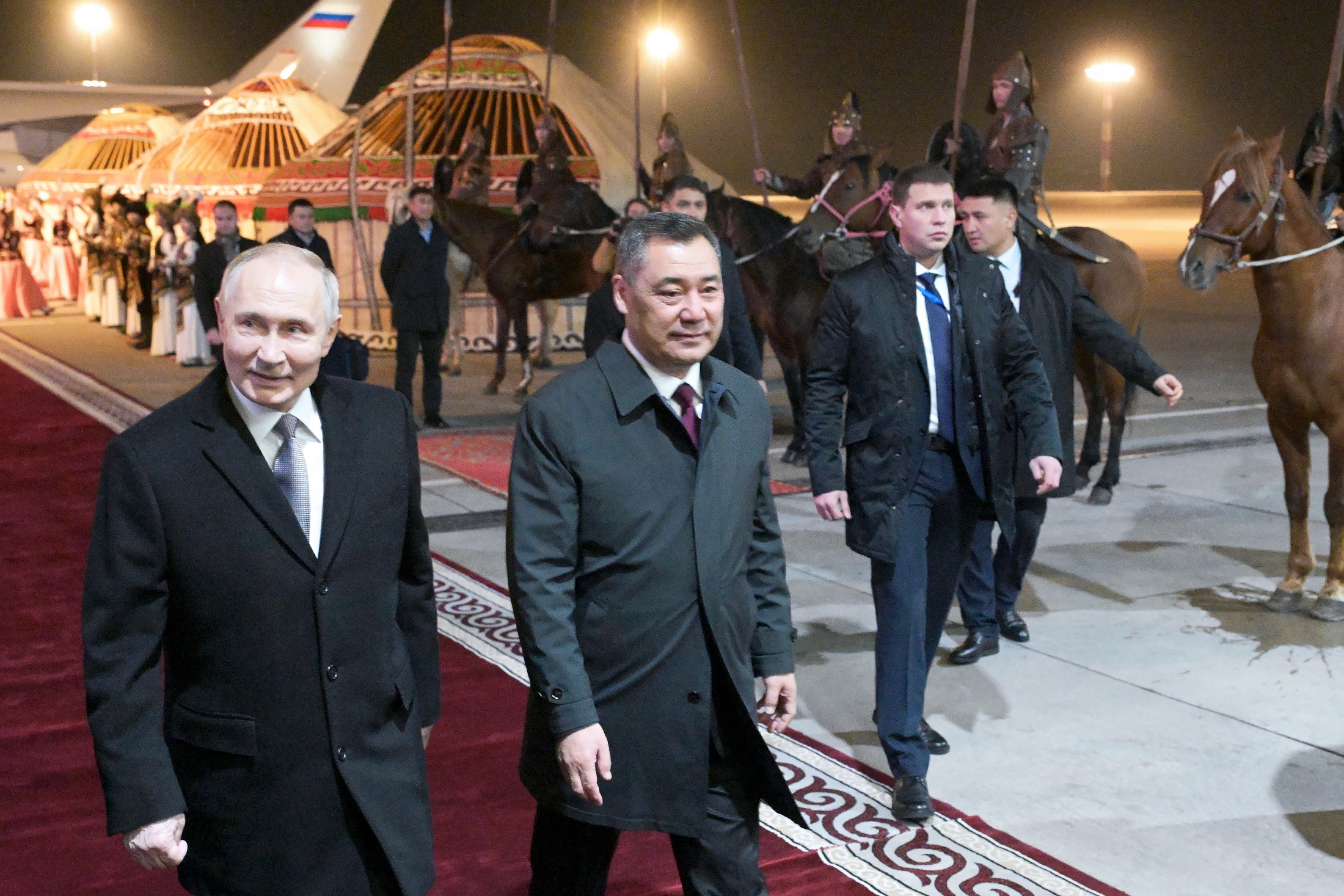Визит начался с пышной церемонии встречи в аэропорту. Президент Киргизии Садыр Жапаров лично приветствовал российского гостя у самолета. Путин спустился по трапу под звуки торжественных фанфар. В аэропорту подняли флаги России и Киргизии, расстелили красную ковровую дорожку и даже расставили юрты.