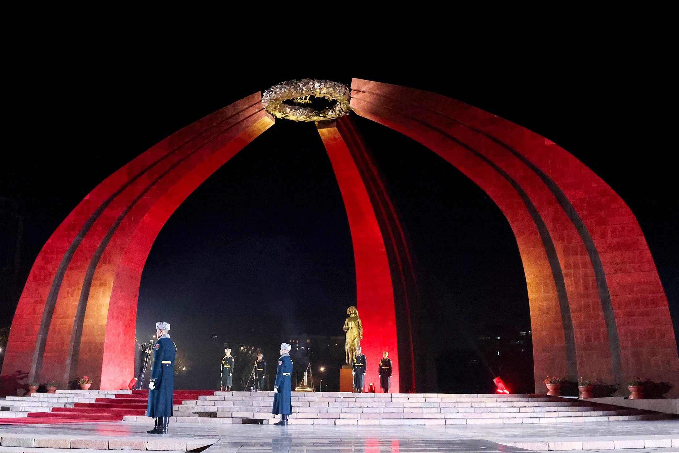 Следом президенты приняли участие в церемонии возложения венков к мемориалу "Вечный огонь" на площади Победы. Основная композиция мемориального комплекса - арка из трех изогнутых линий, которые символизируют юрту, а наверху - венок из металла в честь славы победителей. Под аркой расположена статуя "Мать", которая смотрит вдаль в ожидании мужа и сыновей. У ее ног горит Вечный огонь.