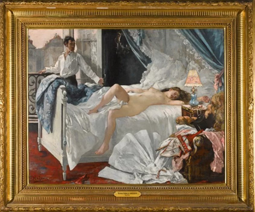Центр композиции - сияющая белизной постель под пышным балдахином. На смятых простынях спит совершенно обнаженная девушка. Ее юное тело представлено зрителю в откровенной позе, которая смущала даже искушенную парижскую публику.